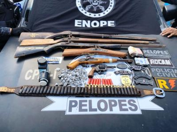 Na oportunidade, foram apreendidas três espingardas, duas garruchas e um revólver calibre 32; além de 35 munições de mesmo calibre, 78 papelotes de maconha, 11 pedras de crack, 13 facas peixeiras, dois facões, nove pássaros silvestres e R$ 870,00 em espécie.