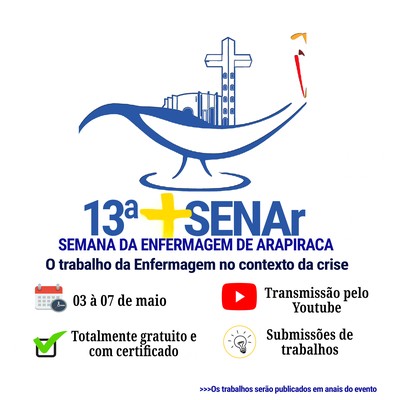 Nesta segunda-feira (3) tem início a 13ª Semana de Enfermagem em Arapiraca (Senar). O evento é uma iniciativa do curso de Enfermagem do Campus Arapiraca e deve incentivar a reflexão sobre a prática profissional da Enfermagem e suas contribuições para a sociedade. As inscrições são gratuitas e ainda podem ser feitas diretamente neste link. As palestras vão sem das 8h as 12h e 13h30 as 17h, todos os dias.