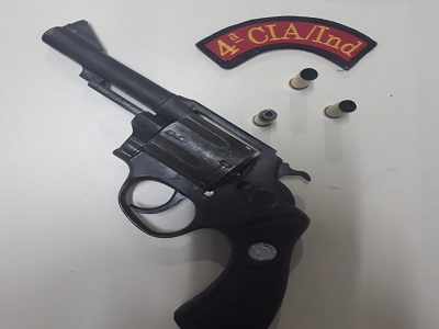 Durante a abordagem foi constatado que o suspeito estava visivelmente embriagado e portava ainda um revólver Taurus calibre 38, com com duas cápsulas deflagradas e uma pinada.