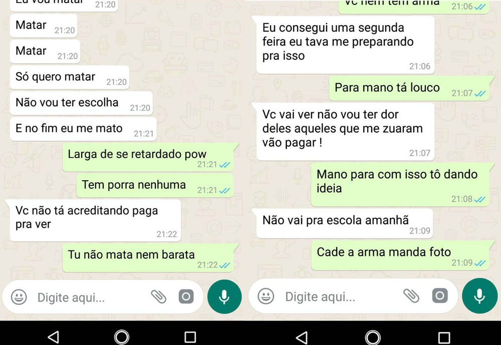 O Batalhão Escolar da Polícia Militar teve acesso às conversas em que o adolescente disse que “quer matar” e que “atiraria” em quem estivesse no colégio. Nas mensagens enviadas a grupos da escola na noite de quarta, o jovem afirmou ainda que estaria se preparando para o crime, divulgou imagens de uma arma e pediu para que um colega faltasse à aula, revela o G1.