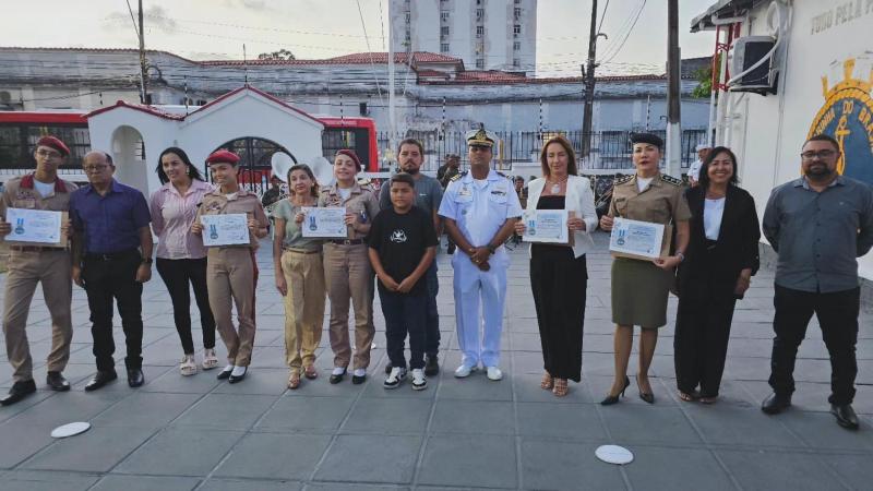 A solenidade contou com a presença de representantes do colégio como a capitã Josineia, o sargento Alves e a diretora Helena Soares, que também foram homenageados pela instituição naval. Os professores Jorge e Ana Rebeca, responsáveis por orientar os alunos, também destacaram-se pelo trabalho pedagógico desenvolvido junto aos jovens.