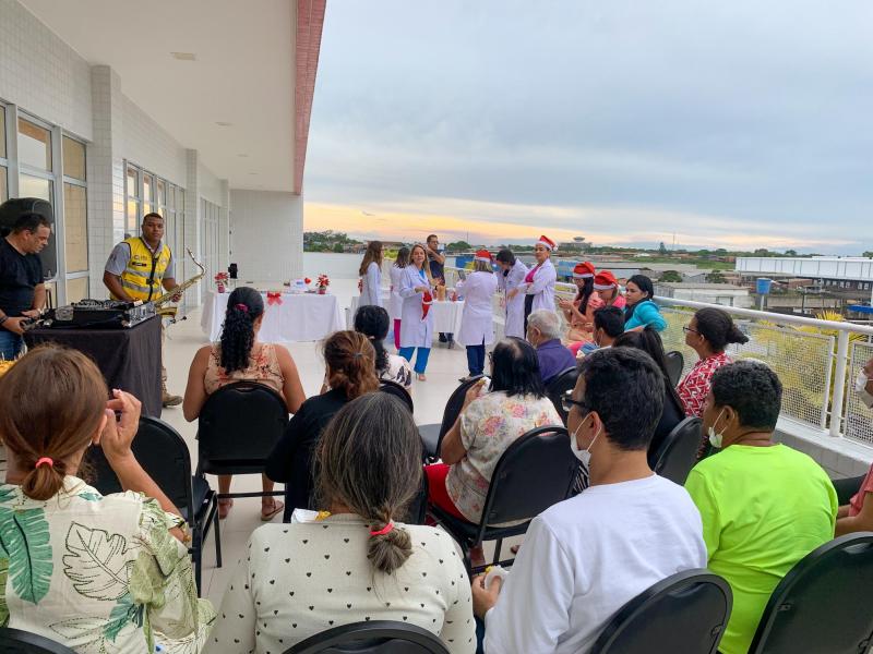 A celebração aconteceu na área externa da unidade hospitalar e contou com música e lanches nutritivos. A iniciativa teve como objetivo contemplar o pôr do sol e criar um momento de interação e confraternização tanto para os pacientes quanto para suas famílias.