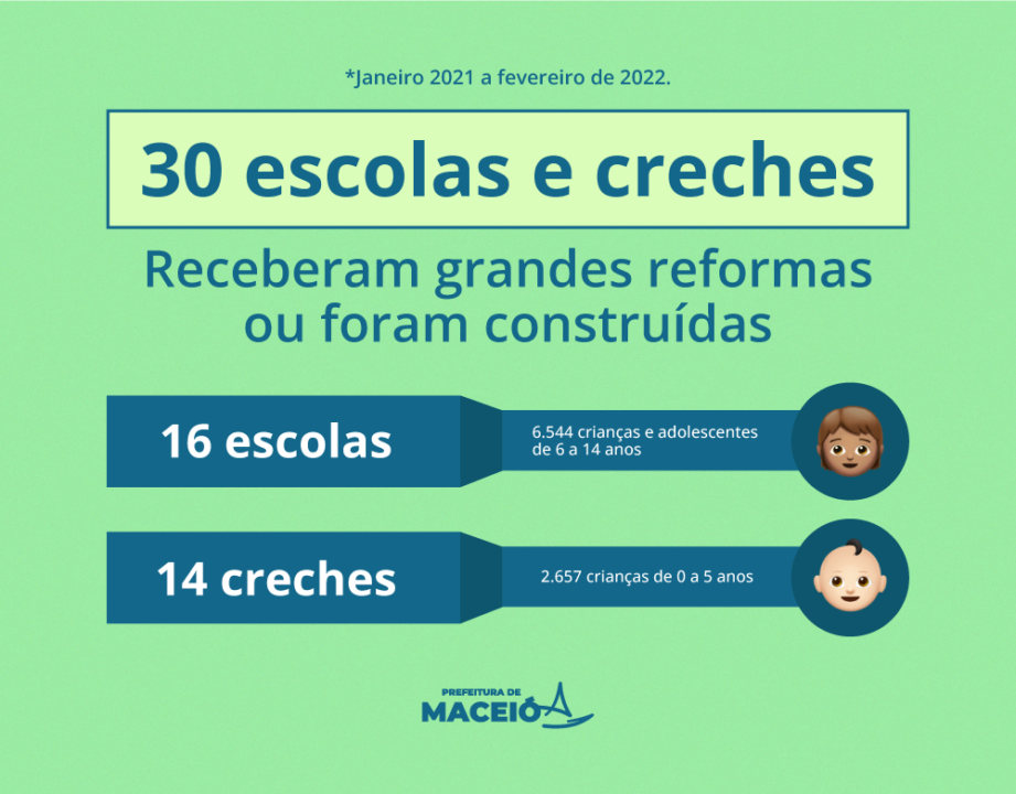 A volta às aulas presenciais após dois anos de isolamento social se tornou melhor, mais segura e confortável com as grandes reformas realizadas pela Prefeitura de Maceió. De acordo com dados da Secretaria Municipal de Educação (Semed), 30 escolas e creches receberam grandes reformas ou foram construídas entre janeiro de 2021 a fevereiro de 2022, beneficiando as 9.201 crianças e adolescentes que estudam nas unidades.