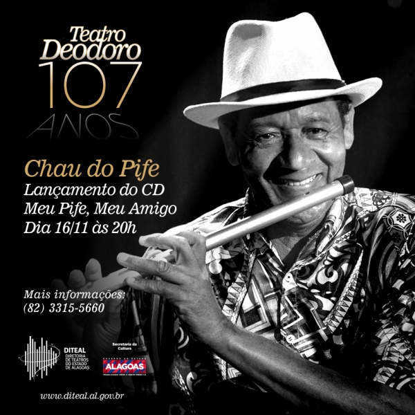 A programação em comemoração ao aniversário de 107 anos do Teatro Deodoro continua nesta quinta-feira (16) com o espetáculo Os Filhos do Céu e os Corações de Tambor, do Coletivo Heteaçã, às 16h, na Praça Deodoro, gratuito. A celebração segue às 20h, no Teatro Deodoro, com o lançamento do CD Meu Pife, Meu Amigo, de Chau do Pife. O ingresso para o show custa R$ 20,00 inteira e R$ 10,00 a meia entrada, na bilheteria do teatro.