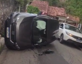 Carro capota na Ladeira da Moenda em Maceió; motorista sai ileso após desvio para evitar colisão. Moradores ajudam na remoção do veículo.
