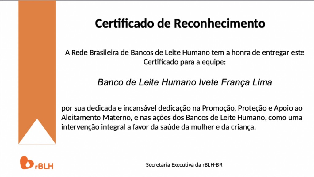 O trabalho desenvolvido pelo Banco de Leite Humano Ivete França Lima foi reconhecido pela Rede Global de Bancos de Leite Humano, uma ação estratégica da Política Nacional de Aleitamento Materno.