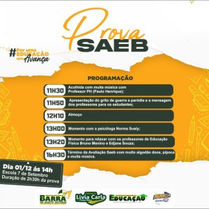 A Prefeitura Municipal de Barra de Santo Antônio, através da Secretaria Municipal de Educação aplicará a prova do SAEB nesta quarta-feira (1) para os alunos da rede pública municipal na escola 7 de setembro.