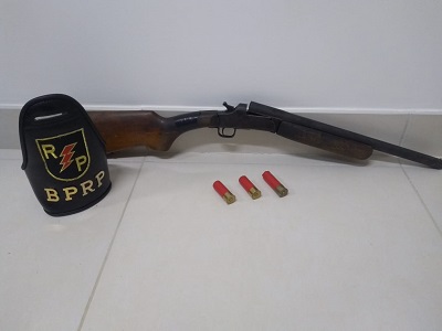 Com o indivíduo que não foi identificado, as equipes encontraram uma espingarda calibre 12, com três munições, sendo duas intactas e uma deflagrada. Participaram da ação as guarnições RP Comando, RP 01 e RP 03.