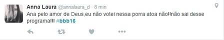 Enquanto tudo isso acontecia, os fãs de Ana Paula agitaram o Twitter. Eles reclamavam que depois de terem votado tanto para ela ficar, a mineira acabou saindo.