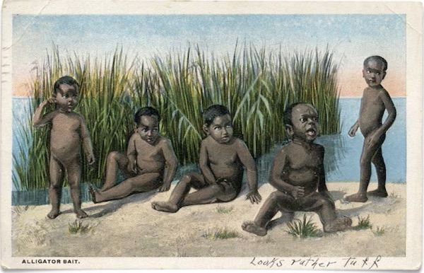 Finalmente, em termos de iconografia, a partir de, pelo menos, a década de 1890 até os anos 1960, as crianças negras eram frequentemente retratado como isca de jacaré nos brinquedos para as crianças brancas, saboneteiras, escovas de dentes, cinzeiros e, especialmente, em cartões postais enviados através do correio dos EUA.