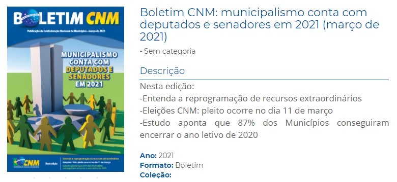 O Boletim da Confederação Nacional de Municípios (CNM) do mês de março já está disponível para download no site da entidade e nos demais canais de comunicação. Nesta edição, um dos destaques é a necessidade da união entre Municípios e Congresso Nacional na busca de soluções contra a pandemia de Covid-19.