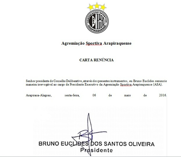 O presidebte executivo da Agremiação Sportiva Arapiraquense (ASA), Bruno Euclides, declara para todos os associados, torcedores e membros do Conselho Delibertativo Alvinegro, renúncia do cargo de diretor executivo do clube de Arapiraca.