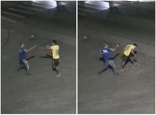 Segundo as imagens, um homem de camisa azul e calça jeans se aproxima da vítima, que veste uma camisa amarela, e realiza os disparos de arma de fogo à queima-roupa.