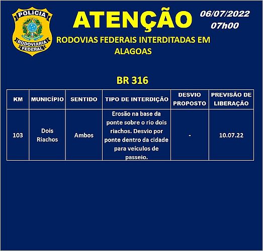 Na BR-316, no trecho do quilômetro 103, em Dois Riachos, há erosão na base da ponte sobre o rio e a interdição deve durar até o dia 10 de julho. Como os dois sentidos estão bloqueados, os condutores são orientados a trafegar por dentro do município para seguir viagem.