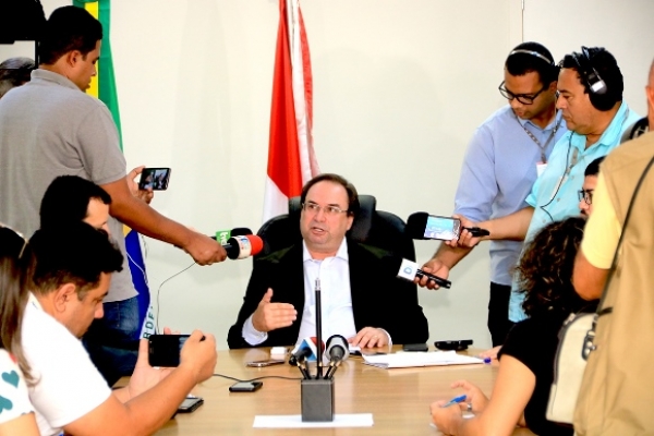 Além do governador em exercício, o secretário do Planejamento, Gestão e Patrimônio (Seplag), Fabrício Marques, participou da coletiva de imprensa no Salão de Despachos.