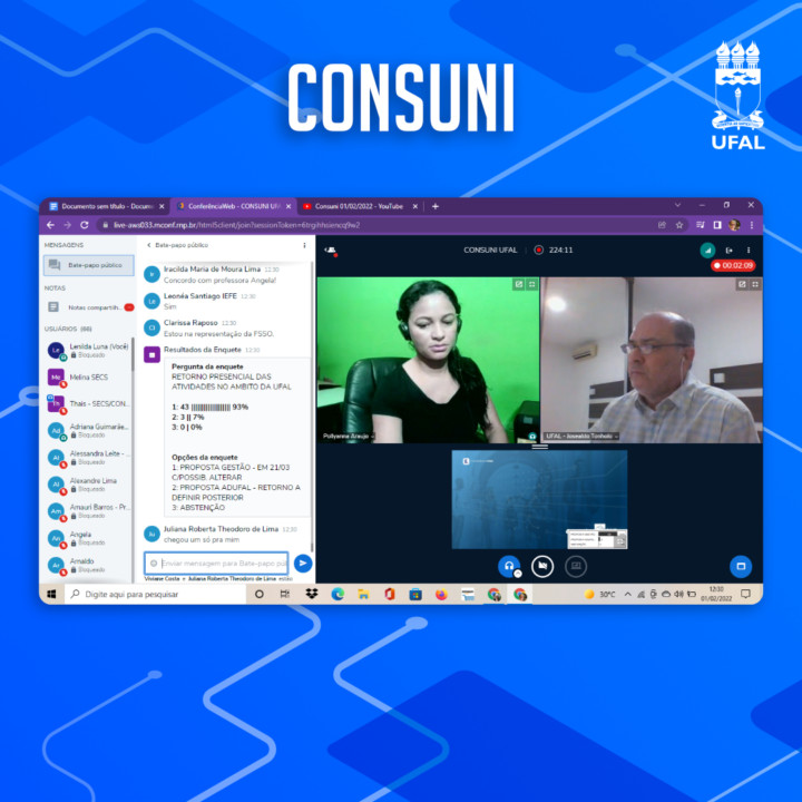 Nesta terça-feira, 1º de fevereiro, o Conselho Universitário deu continuidade à sessão ordinária iniciada na semana passada, com o principal objetivo de debater o retorno presencial das aulas na Universidade Federal de Alagoas (Ufal). A sessão virtual foi transmitida pelo canal oficial no Youtube com uma audiência bastante participativa através de manifestações no chat. Foram mais de três horas de debate, com apresentações de estudos e planos, até chegar a uma deliberação, que deve ser detalhada na sessão que continua na próxima terça-feira (8).