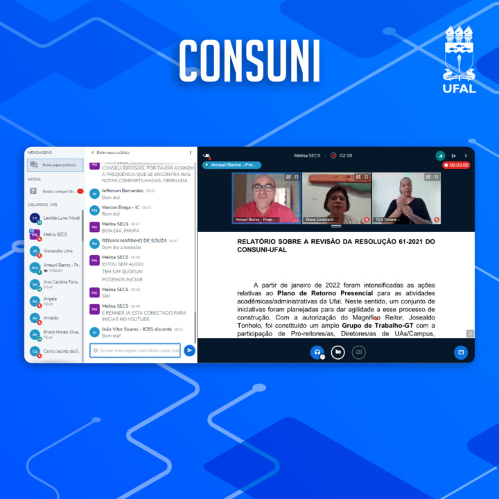 O Conselho Universitário (Consuni) da Universidade Federal de Alagoas (Ufal) retomou, nesta terça-feira (15), a sessão ordinária para análise do cenário da pandemia de covid-19 e discussão sobre viabilidade de retorno presencial. O indicativo de retomar aulas presenciais a partir do semestre 2021.2, no próximo 21 de março, já foi aprovado no início de fevereiro, mas, na sessão de hoje, foi aprovado o calendário acadêmico-administrativo do ensino de graduação.