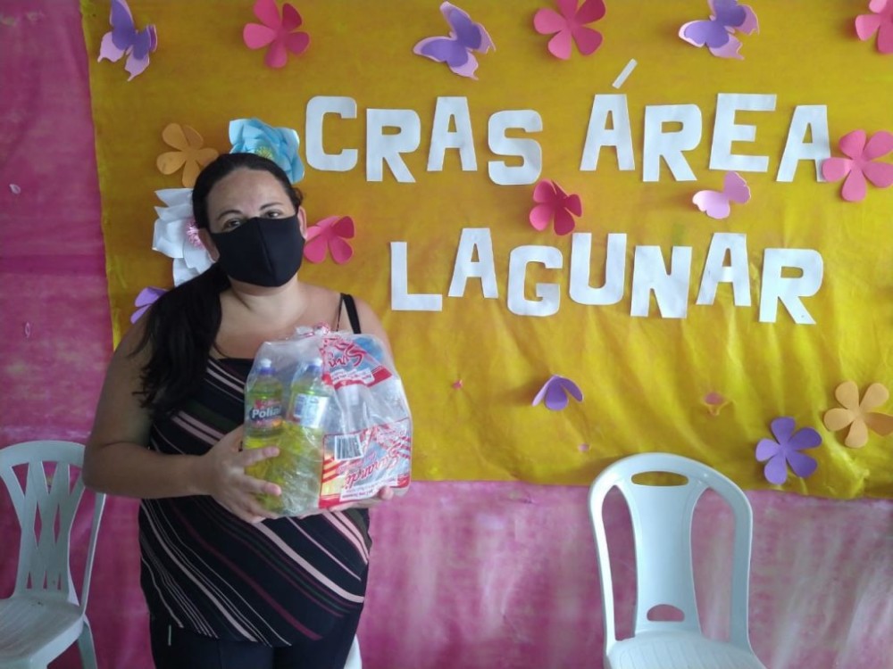 No Cras Área Lagunar, também estão sendo entregues as cestas básicas as famílias retardatárias da região, que não receberam durante as etapas anteriores da Semas. Essas cestas foram financiadas com recursos do Fundo Estadual de Combate e Erradicação da Pobreza (Fecoep).