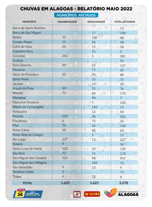 A Coordenadoria Estadual de Defesa Civil de Alagoas (Cedec) divulgou, no final da tarde desta quinta-feira (26), a atualização do número de desabrigados e desalojados em razão das fortes chuvas que caem em Alagoas desde a última terça-feira (24). Os 33 municípios mais atingidos pelo temporal já somam 1.655 desabrigados e 1.623 desalojados. A população total atingida chega a 3.278.