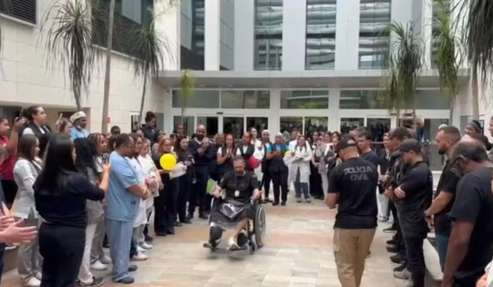 Durante a sua saída, o delegado fez questão de exibir seu distintivo da Polícia Civil e carregava uma bandeira da Delegacia de Repressão a Entorpecentes (DRE), do qual é membro. Em um breve discurso, ele expressou sua gratidão por todo o apoio recebido nesse período crítico, ressaltando a solidariedade e o carinho que o cercaram durante sua luta pela recuperação.