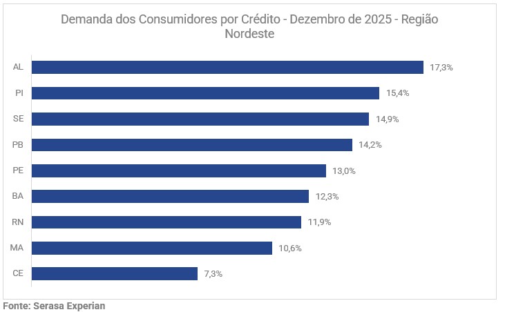 A busca por crédito no Nordeste apresentou crescimento em todas as unidades federativas ao longo de 2025, conforme aponta o Indicador de Demanda dos Consumidores por Crédito da Serasa Experian. Entre os estados, Alagoas registrou o maior avanço da região, com alta de 17,3% no período.