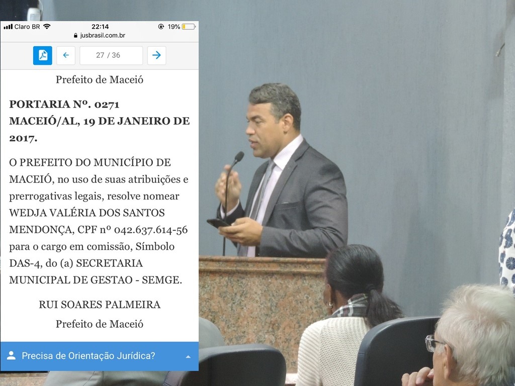 Isto demonstra que não é de hoje a Suprema Corte vem manifestando sua posição contrária ao nepotismo, por ser este uma prática ilegítima e incompatível a forma republicana e democrática de gestão da coisa pública. Ao dizer que os princípios constitucionais da moralidade, da impessoalidade, da igualdade e da eficiência são auto-aplicáveis e, portanto, dotados da necessária carga de taxatividade e de positividade para vedar a prática do nepotismo, entendemos que a decisão do STF constitui um exemplo significativo de produção judicial do direito.O Vereador por Maceió Siderlane Moura em discurso na Câmara Municipal de Maceió nesta última quarta-feira dia 13 de junho de 2018, afirmou que é normal que primeiro teria que colocar nos espaços políticos seus parentes, afirmando “Primeiro os Meus”, a equipe investigativa do “O Fato” constatou que a esposa do Vereador, ocupa cargo em comissão na Prefeitura de Maceió, como consta na portaria abaixo.