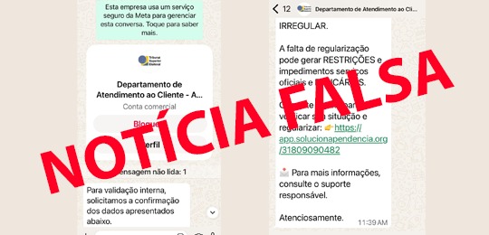A Justiça Eleitoral alerta que é falsa a mensagem que está circulando em grupos de WhatsApp que diz que uma situação irregular perante a Justiça Eleitoral poderá suspender o acesso dos cidadãos aos serviços bancários ou a quaisquer outros serviços oficiais do governo.