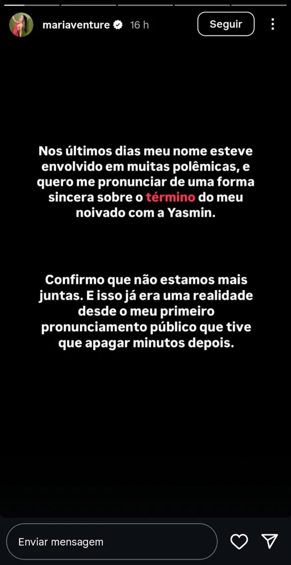 Maria começou seu desabafo reconhecendo a intensa repercussão sobre sua vida pessoal nos últimos dias. Ela confirmou que, embora muitos não soubessem, a separação já era uma realidade desde o momento em que fez uma declaração pública sobre o relacionamento, que acabou tendo que apagar pouco tempo depois. “Nos últimos dias meu nome esteve envolvido em muitas polêmicas, e quero me pronunciar de uma forma sincera sobre o término do meu noivado com a Yasmin”, afirmou.