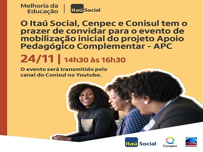 Acontece nesta quarta-feira, dia 24, a partir das 14h30, o primeiro Evento de Mobilização Inicial do Projeto Apoio Pedagógico Complementar (APC), uma das tecnologias do Programa Melhoria da Educação, promovida pelo Itaú Social em parceria com o Cenpec e Conisul.