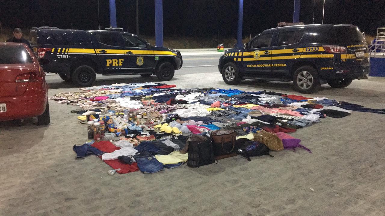 Uma equipe da PRF avistou um I/Fiat, de cor vermelha – com cinco ocupantes, pegando um desvio na rodovia, para não passar em frente a Unidade Operacional de Polícia (UOP). Desconfiados, os policiais seguiram o carro e o abordou. Seus ocupantes mostraram nervosismo e os agentes observaram que dentro do veículo havia diversas sacolas plásticas contendo inúmeras unidades de vestuário, faqueiros, bolsas, calçados, etc – muitas peças ainda com etiqueta e dispositivo de segurança de alarme contra furto. Ao todo, foram encontradas 400 itens com etiquetas de diversas lojas como Lojas Americanas, Riachuelo e C&A.