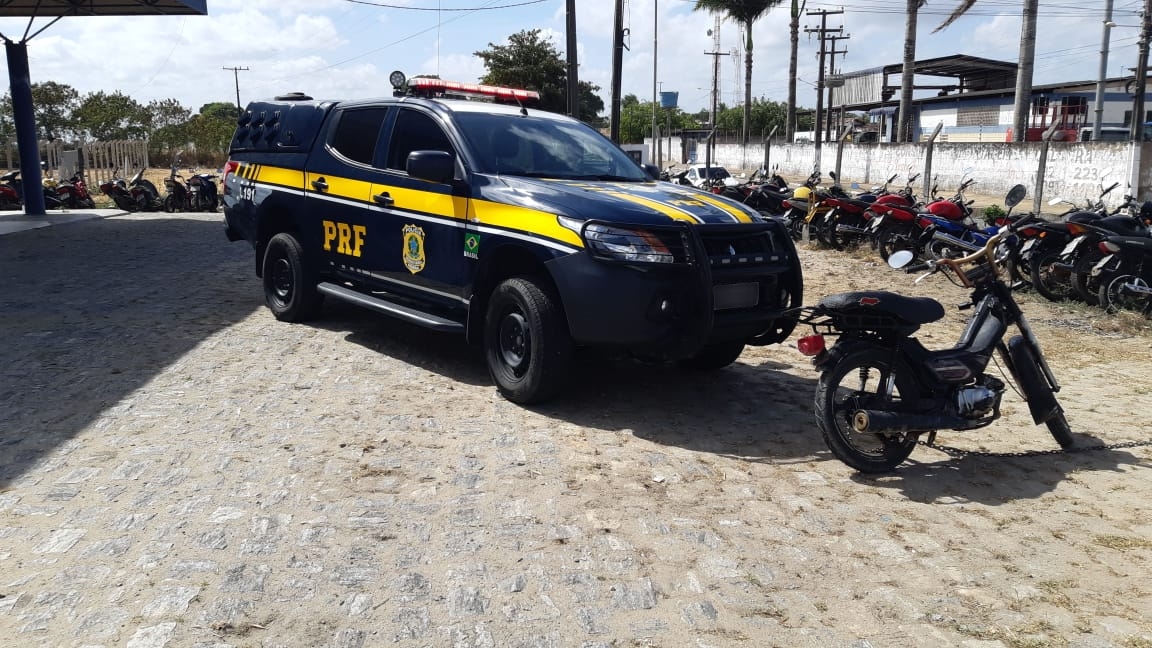 Uma equipe da PRF deu ordem de parada a um ciclomotor, de cor preta, com um ocupante. Durante os procedimentos de verificação, os policiais constataram que o número do motor estava suprimido e o do chassi não foi encontrado nos sistemas. Questionado, o condutor informou que havia trocado um aparelho de som pelo veículo há cerca de três meses, porém alegou desconhecer as irregularidades encontradas.