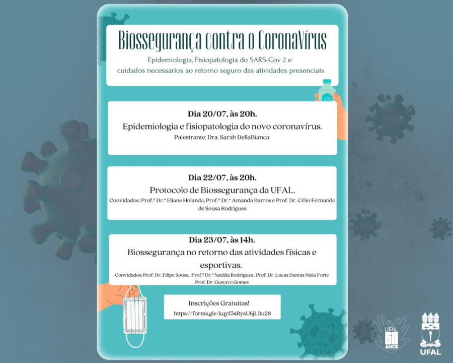 No dia 22, no mesmo horário, o tema em discussão é o Protocolo de Biossegurança da Ufal, com a participação da vice-reitora da Ufal, Eliane Cavalcanti; a professora Amanda Barros, do Laboratório de Farmacologia Cardiovascular (Ufal), do Laboratório de Aterosclerose Humana e Experimental (Uncisal) e do grupo de pesquisa Morfologia e Saúde (Ufal); e Célio Rodrigues, superintendente do Hospital Universitário Professor Alberto Antunes (HU) da Ufal.