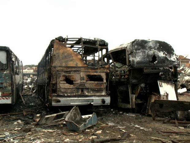 As chamas destruíram totalmente dois ônibus e parte de outro. Foram enviadas quatro viaturas dos Bombeiros para o local. Quando os militares chegaram os veículos ainda estavam em chamas.