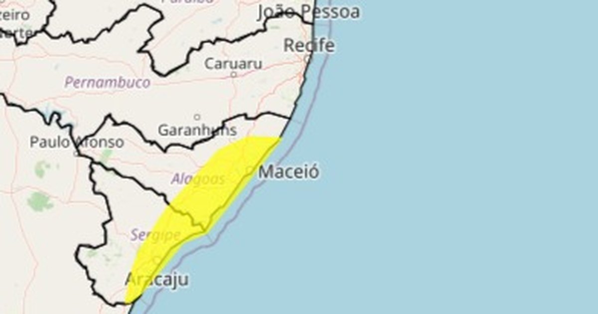 Os municípios relacionados no alerta amarelo incluem Anadia, Arapiraca, Atalaia, Barra de Santo Antônio, Barra de São Miguel, Boca da Mata, Cajueiro, Campo Alegre, Campo Grande, Capela, Coqueiro Seco, Coruripe, Feira Grande, Feliz Deserto, Flexeiras, Igreja Nova, Jequiá da Praia, Limoeiro de Anadia, Maceió, Marechal Deodoro, Maribondo, Matriz de Camaragibe, Messias, Murici, Olho d’Água Grande, Paripueira, Passo de Camaragibe, Penedo, Piaçabuçu, Pilar, Pindoba, Porto de Pedras, Porto Real do Colégio, Rio Largo, Roteiro, Santa Luzia do Norte, São Brás, São Luís do Quitunde, São Miguel dos Campos, São Miguel dos Milagres, São Sebastião, Satuba, Tanque d’Arca, Taquarana, Teotônio Vilela e Viçosa.