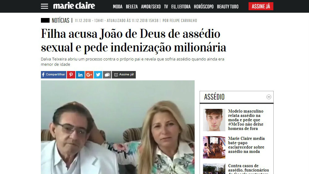 A revista Marie Claire procurou o advogado que representa João de Deus no processo, mas não recebeu retorno até a publicação da matéria. Na última semana, 25 mulheres denunciaram o médium por abusos sexuais durante décadas, inclusive quando algumas delas eram menores de idade. As denúncias foram feitas em programas da TV Globo.