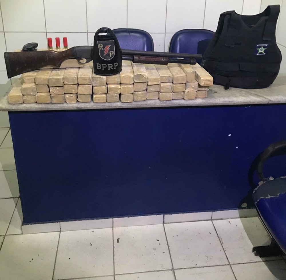 Militares do Batalhão de Polícia de Radiopatrulha (BPRp) foram na residência desocupada e encontraram 30 kg de maconha, junto com um colete balístico, uma espingarda calibre 12 e munições.
