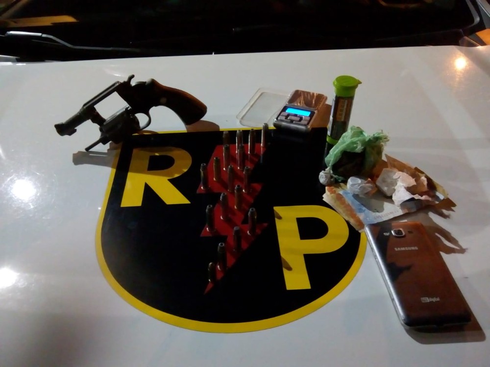 Com o suspeito foi encontrado um revólver de calibre .38 municiado. Dentro da residência foram achados 11 munições de calibre .357, uma munição calibre .32, uma balança de precisão, 55 gramas de maconha, 10 gramas de crack e R$ 142.