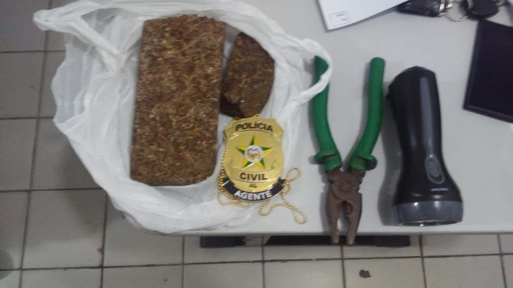 Foram apreendidos com o suspeito, um tablete de maconha, uma lanterna e um alicate, que, segundo a polícia, podem ter sido utilizados nos furtos.