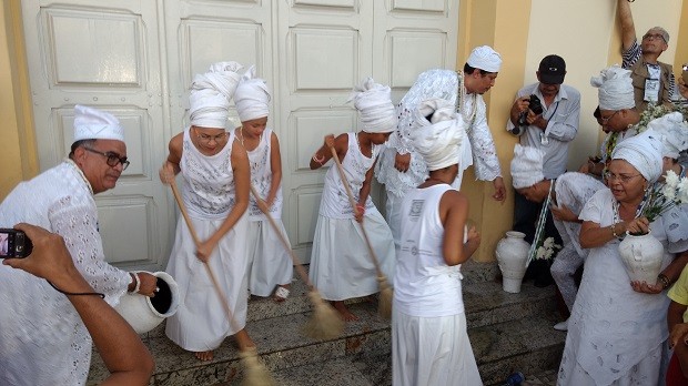 Praticantes e simpatizantes de religiões de matriz africana realizaram, neste domingo (8), a tradicional lavagem do pátio da Igreja do Senhor do Bonfim, no bairro do Poço, em Maceió. Vindos de diversas partes da capital e do interior, e vestidos de branco, os participantes pediram respeito e tolerância.