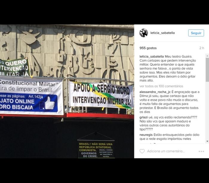 “Meu teatro Guaíra. Com cartazes que pedem intervenção militar. Queria entender o que aquela senhora me falava , o ponto de vista sobre isso. Mas eles não falam por argumentos. Eles deixam o ódio gritar mais alto”, postou.
