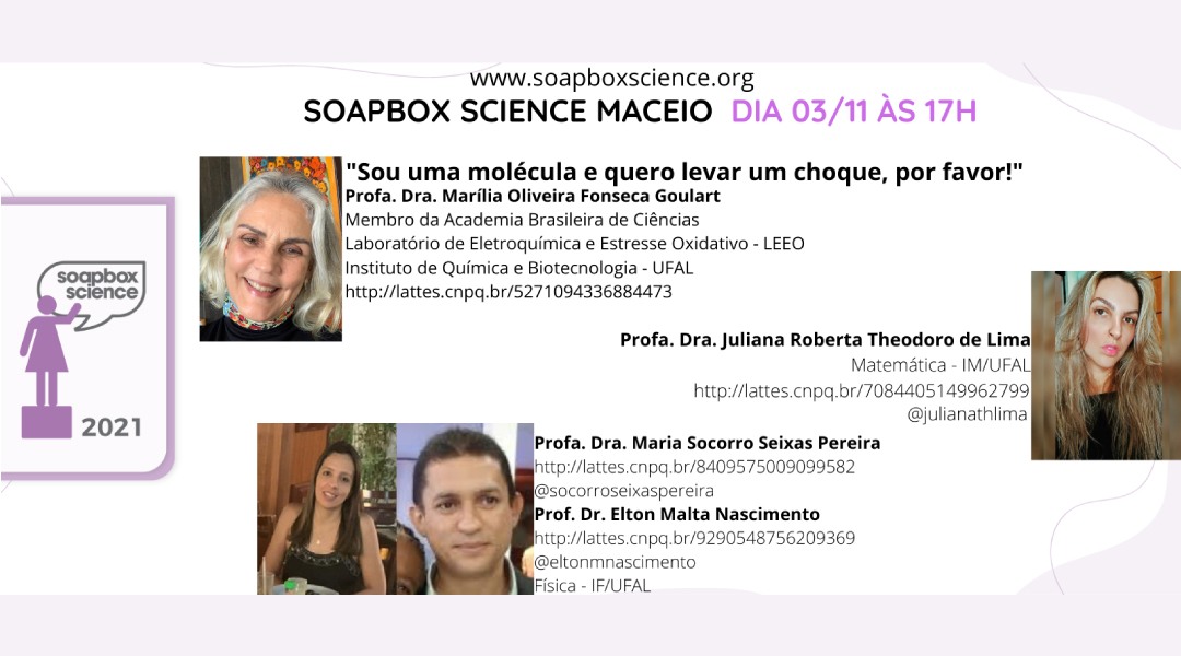 Um espaço digital tem projetado mulheres cientistas de todo o mundo para falar sobre ciência de forma simples. O Soapbox Science é uma plataforma internacional que ganhou organizadores e público cativo no Brasil. Os debates ocorrem frequentemente no Youtube e são divulgados na página oficial do Instagram. Em Maceió, a equipe prepara um final de semana inteiro de programação, nos dias 27 e 28 de novembro. Mas, já na próxima quarta-feira (3), às 17h, uma live com a professora Marília Goulart, do Instituto de Química e Biotecnologia (IQB), vai encerrar os debates ao vivo, no Youtube, que antecedem o evento.