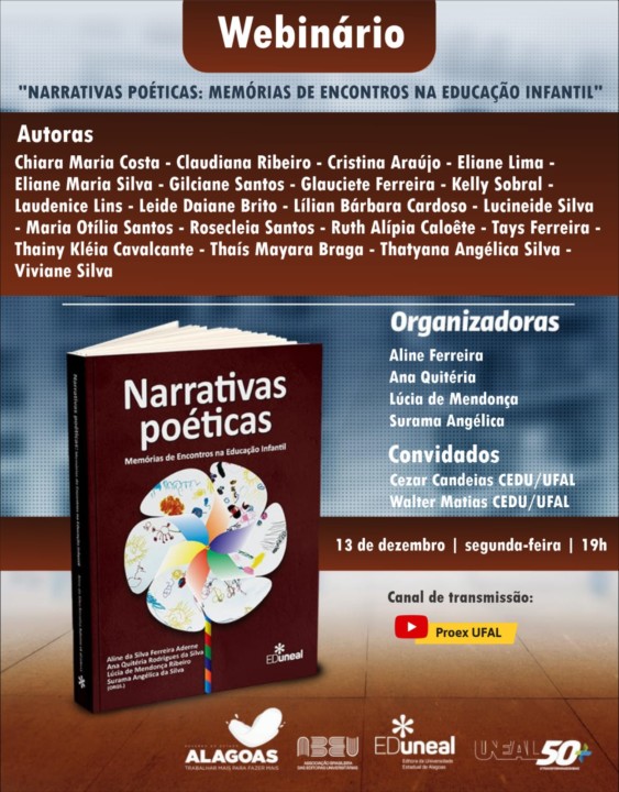 A editora da Universidade Estadual de Alagoas (Eduneal) e a Editora da Universidade Federal de Alagoas lançam nesta terça-feira, 7, às 19h30 no complexo cultural do Teatro Deodoro uma série de livros, mais precisamente oito livros escritos por intelectuais e pesquisadores alagoanos. Dentre eles está o livro “Narrativas poéticas: memórias de encontros na educação infantil” organizado pelas professoras Aline da Silva Ferreira Aderne (Ufal, Unidade de Educação Infantil Professora Telma Vitória); Ana Quitéria Rodrigues da Silva (Centro Municipal de Educação Infantil – CMEI Herme Miranda – Secretaria Municipal de Educação de Maceió); Lúcia de Mendonça Ribeiro (CMEI Herme Miranda – CMEI Maria de Fatima Melo dos Santos) e a professora Surama Angélica da Silva (Ufal, Unidade de Educação Infantil Professora Telma Vitória).