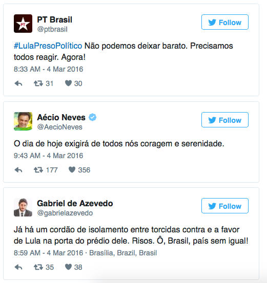 As postagens se relacionam à 24ª fase da operação Lava Jato, denominada Aletheia, na qual o ex-presidente Luíz Inacio Lula da Silva é obrigado a depor sobre os casos de corrupção na Petrobras.
