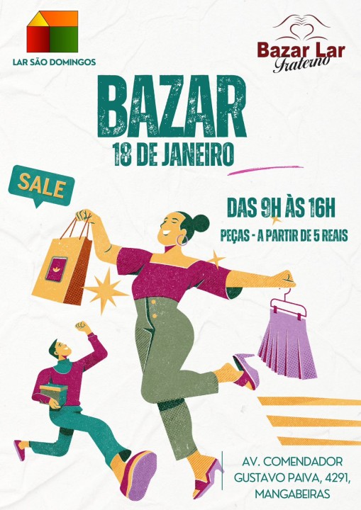 O Bazar Lar Fraterno e o Bazar Chique vão realizar no próximo domingo (18) a primeira edição do bazar deste ano, que funcionará 9h às 16h e fica situado dentro do Lar São Domingos, na Av. Gustavo Paiva, 4291, Mangabeiras.