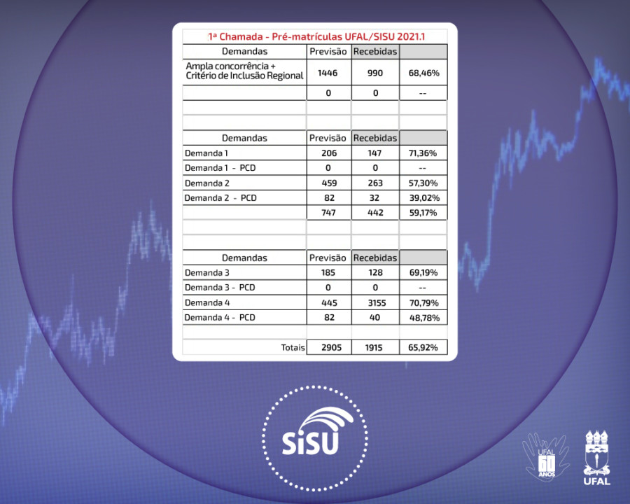 Dos 1.446 candidatos aprovados na Ampla Concorrência, 990 realizaram a pré-matrícula online. Já na Demanda 1, 71,36% dos classificados enviaram a documentação no prazo, ou seja, os alunos que cursaram ensino médio em escolas públicas, com renda familiar per capta igual ou inferior a 1,5 salário mínimo.