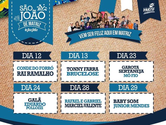 “Vem ser feliz aqui em Matriz” esse é título que marca o São João 2017, na cidade da região Norte de Alagoas, que montou uma grande estrutura  de palco e segurança em praça pública, com planos para receber gente de toda parte, como já é tradição em todo período junino. Os organizadores afirmam, que além do evento oferecer uma boa opção artística  musical, haverá também uma ampla comercialização de produtos alimentícios típicos da época, apresentação de quadrinhas entre outros folguedos populares.