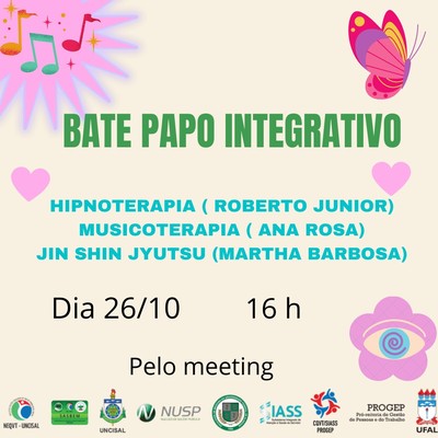 Nesta terça-feira (26), acontece mais uma edição do Momento Integrativo, projeto que divulga práticas alternativas aos servidores da Universidade Federal de Alagoas, proporcionando momentos de integração e bem-estar. Desta vez o bate-papo aborda Hipnoterapia, Musicoterapia e Jin Shin Jyutsu, uma arte que ajuda a liberar tensões pelo toque das mãos.