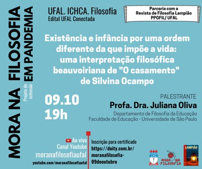 No próximo dia 9 de outubro, a partir das 19h, acontece mais uma edição do projeto Mora na Filosofia. Essa ação continua realizando edições virtuais por conta da pandemia e debate, desta vez, a Existência e Infância por uma Ordem Diferente da que Impõe a Vida: Uma Interpretação Filosófica Beauvoiriana de O Casamento, de Silvina Ocampo. Para acompanhar a palestra, faça a inscrição no site e clique aqui para assistir.