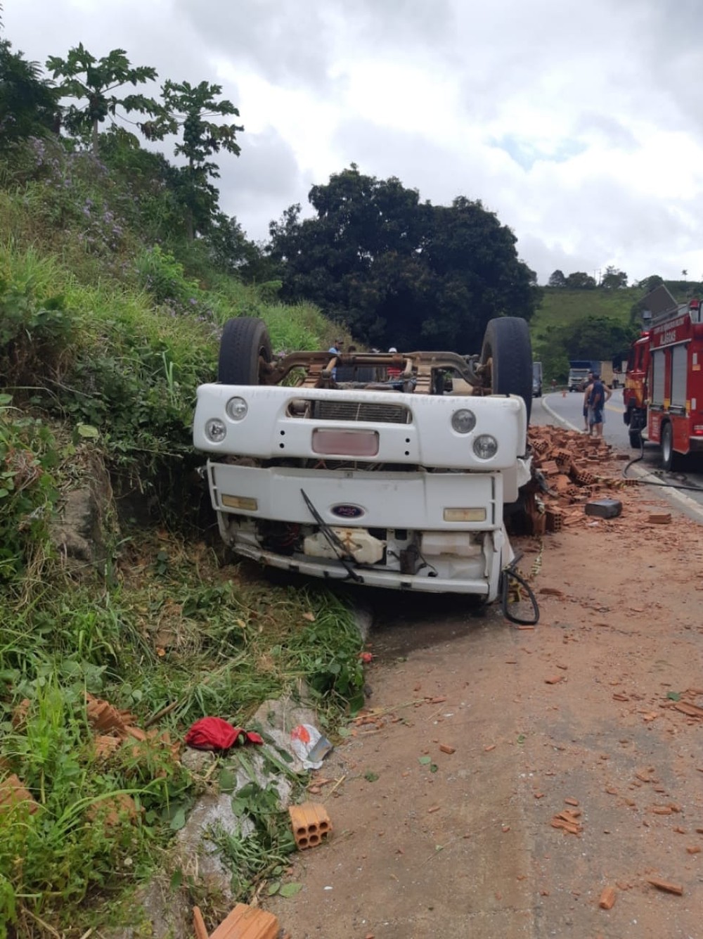 Um motorista ficou ferido após um caminhão carregado de tijolos tombar na BR-104, em São José da Laje, na manhã desta sexta-feira (11).