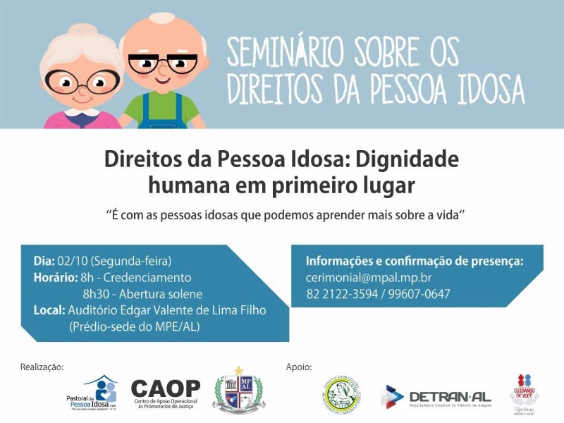 O Ministério Público do Estado de Alagoas (MPE/AL), por meio do Centro de Apoio Operacional às Promotorias de Justiça (CAOP) e em parceria com a Pastoral da Pessoa Idosa, realizará nesta segunda-feira (2), a partir das 8h, o Seminário da Pessoa Idosa. O evento, que tem como tema “Direitos da Pessoa Idosa: dignidade humana em primeiro lugar” e lema “É com as pessoas idosas que podemos aprender mais”, objetiva discutir as garantias e a efetivação dos direitos das pessoas com mais de 60 anos.